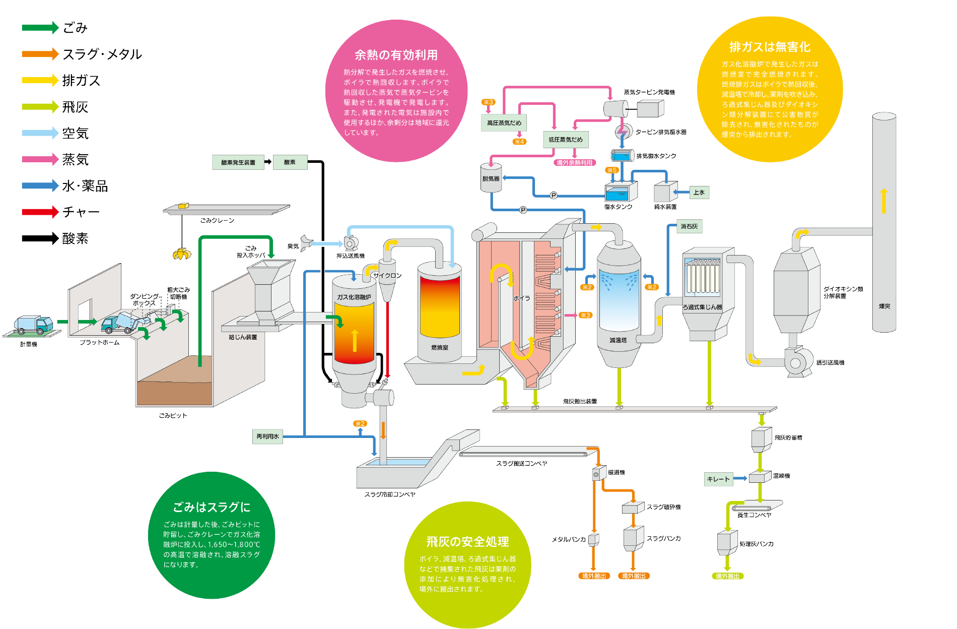 当社の酸素式熱分解直接溶融炉(CEAS)はごみ自身の熱量でごみを溶かし、その熱で発電して酸素製造を含む所内電力を賄える「自己完結型」をコンセプトに開発されたガス化溶融炉です。